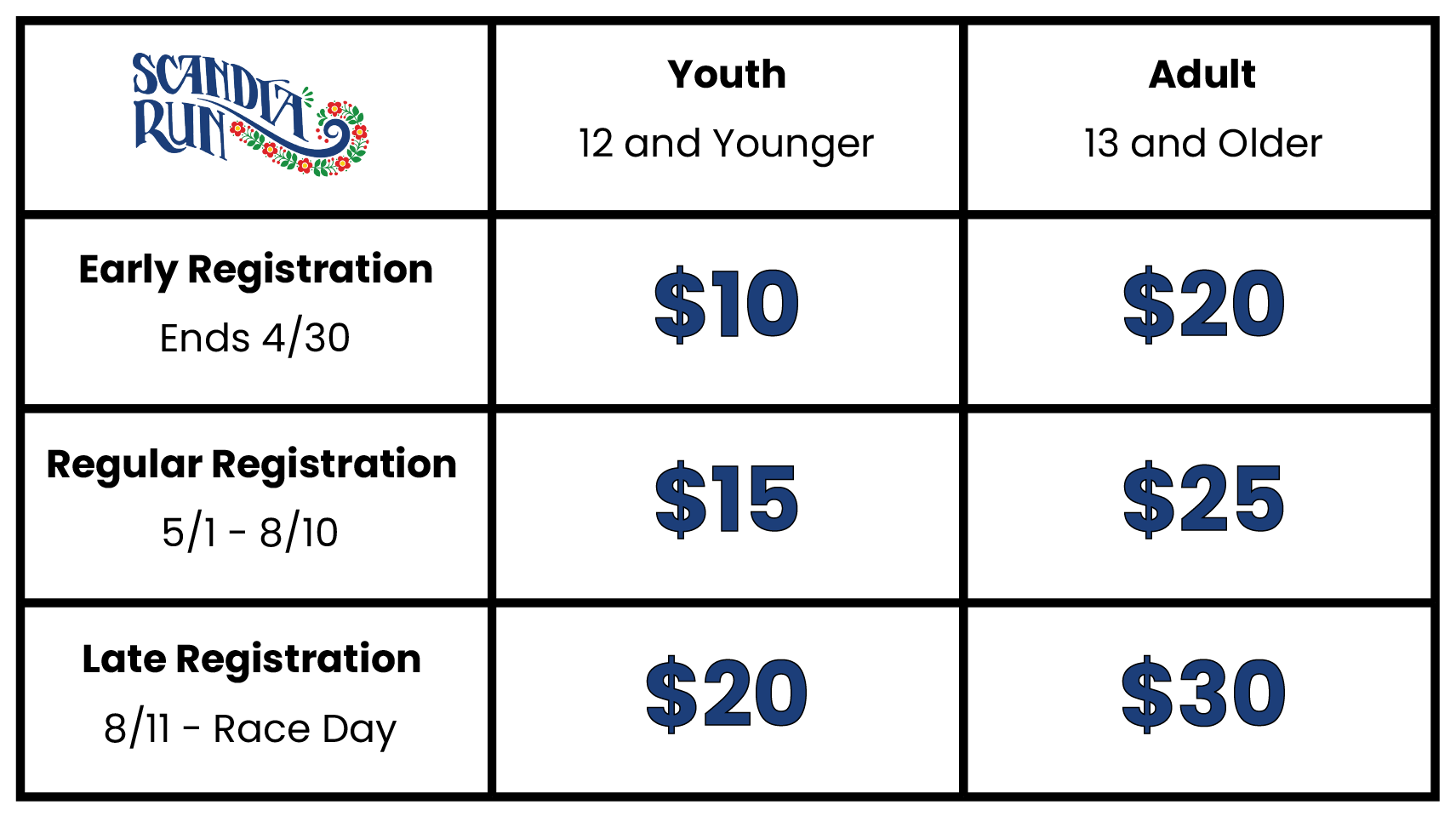 The coveted Scandia Run T-Shirts can be purchased during registration for $20. Kids’ “Run with the Vikings” registration includes a youth sized shirt at no extra cost.